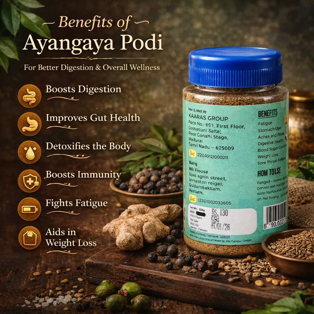 Angaya Podi is a traditional South Indian herbal powder made with dried neem flowers and Ayurvedic spices. Known for its antioxidant properties, this blend supports digestion, boosts immunity, and helps detoxify the body. A staple in many households, it is enjoyed for its natural health benefits and aromatic flavor, often sprinkled over rice or mixed with ghee.