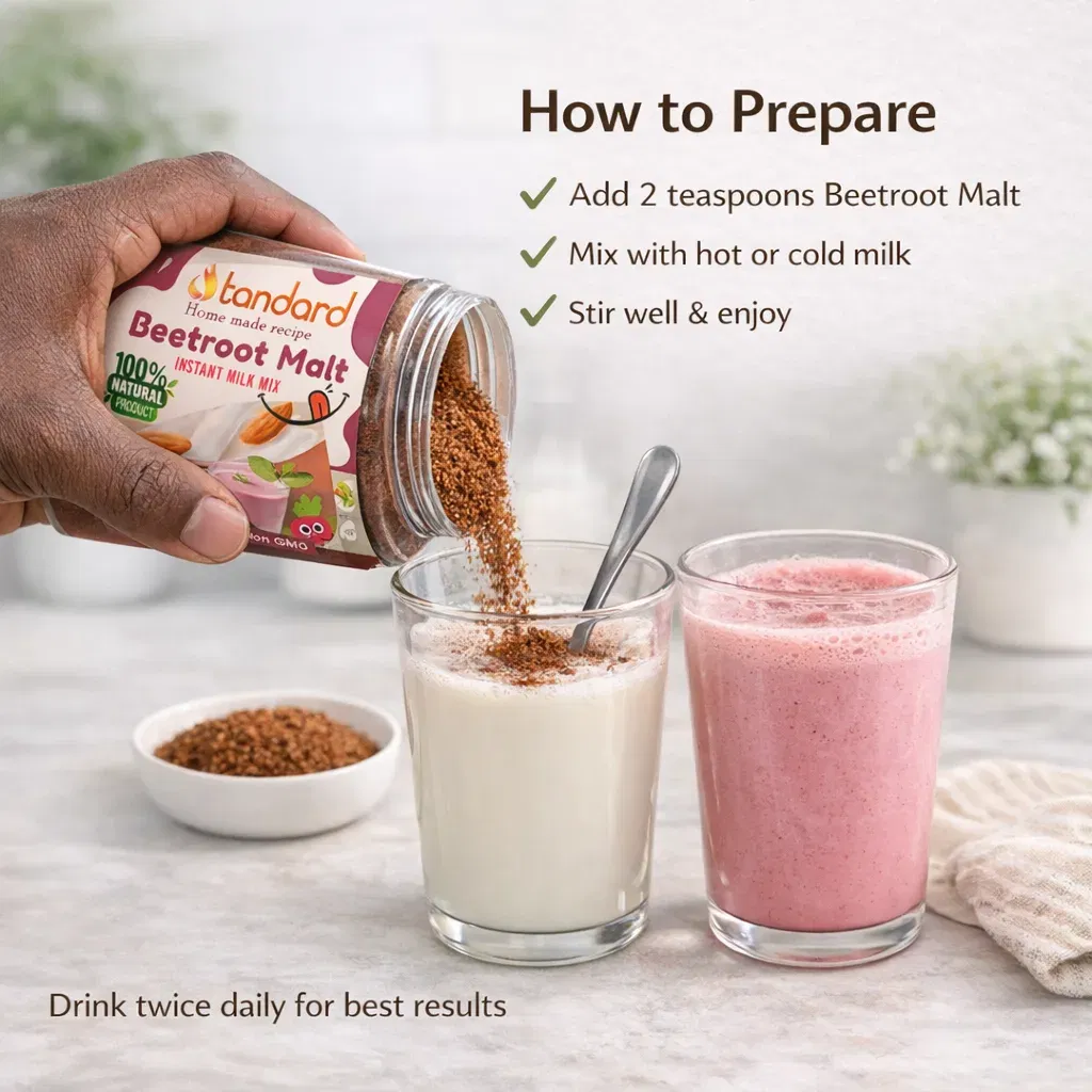 I mix 1 spoon of beetroot malt with hot milk or hot water, then drink it to feel the benefits fast.