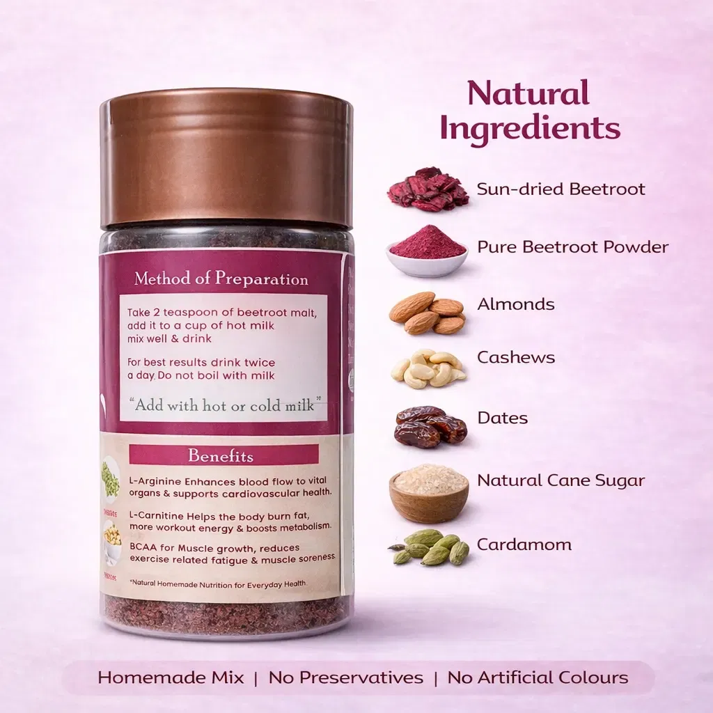Beetroot Malt packs iron, antioxidants, and natural energy in one easy mix. Just add a spoon to hot milk or water, and you get a tasty health boost fast. This drink helps with blood flow, heart health, and keeps your energy up without any junk added.