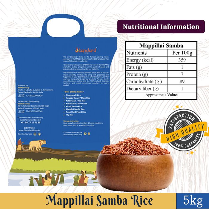 Mappillai Samba rice is also considered to be a healthier alternative to other varieties of rice because it has a low glycemic index, which means it causes a slower and lower rise in blood sugar levels compared to other types of rice. It is also rich in antioxidants and essential nutrients like iron and calcium.