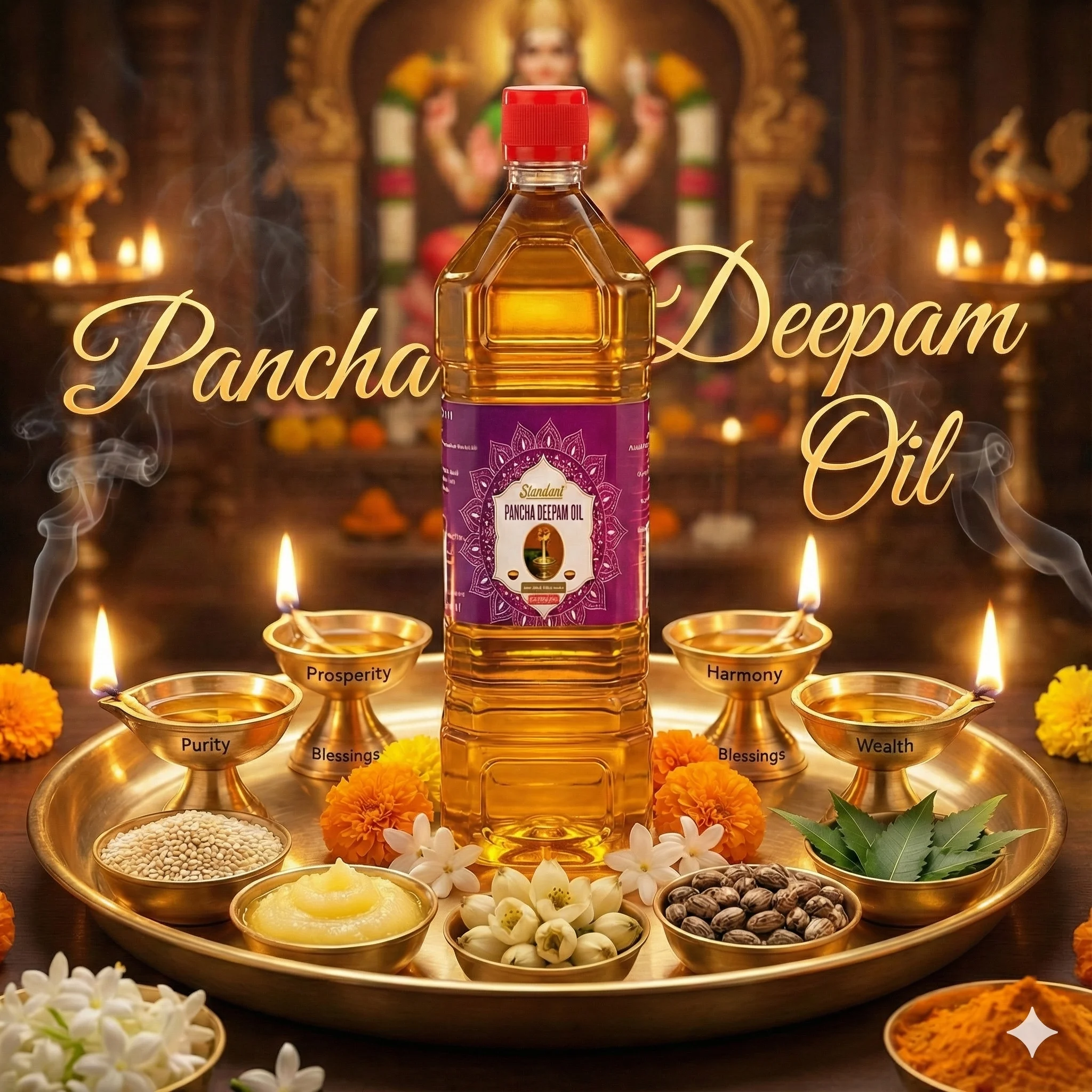 This five-oil blend, also known as Pancha Deepam oil, was mentioned in the Agama Shastras as a way to invoke the blessings of various deities, with each oil attracting specific energies beneficial to the household.