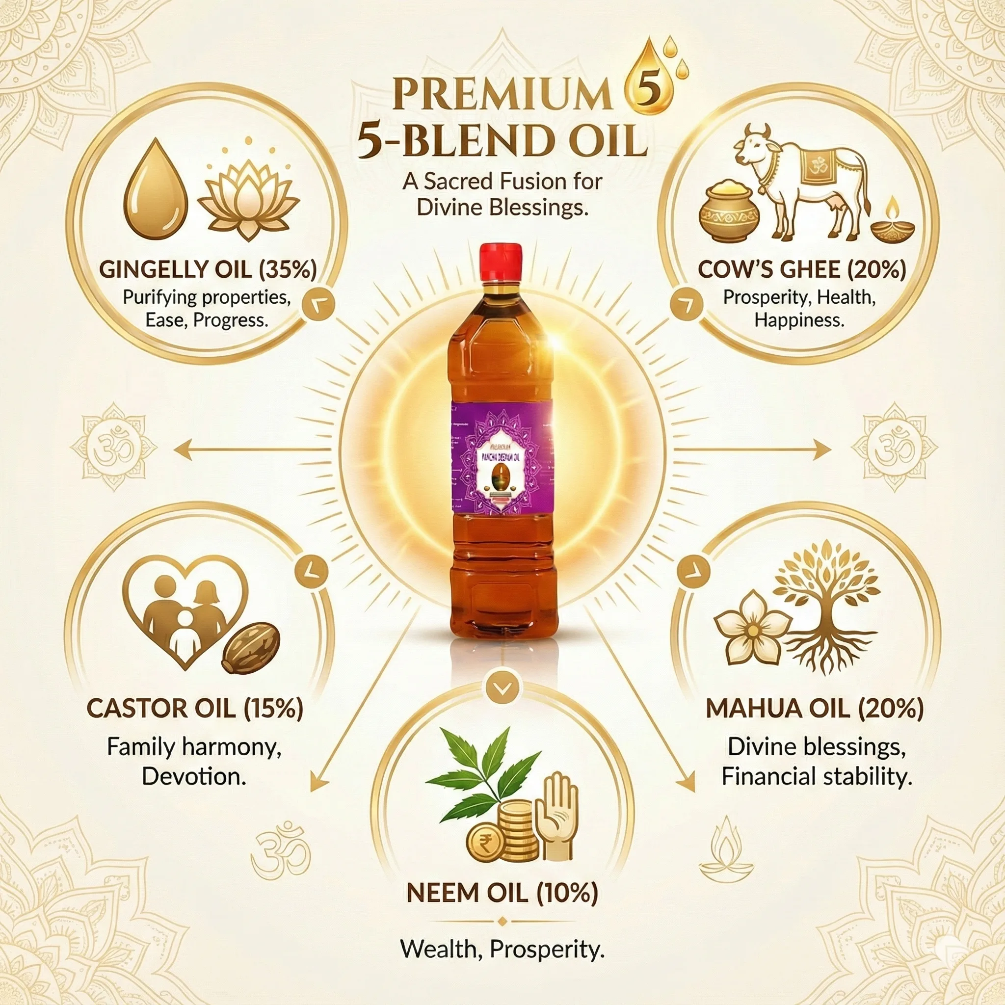 - Mahua Oil (20%): Invokes divine blessings and aids financial stability.