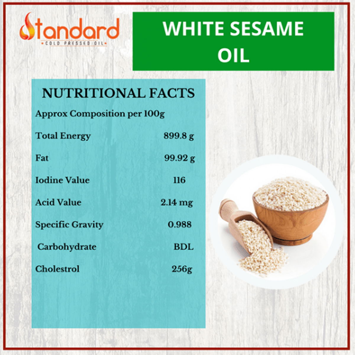 - Rich in Omega-6 Fatty Acids: White sesame oil contains about 41% omega-6 fatty acids, which are known for their role in heart health.