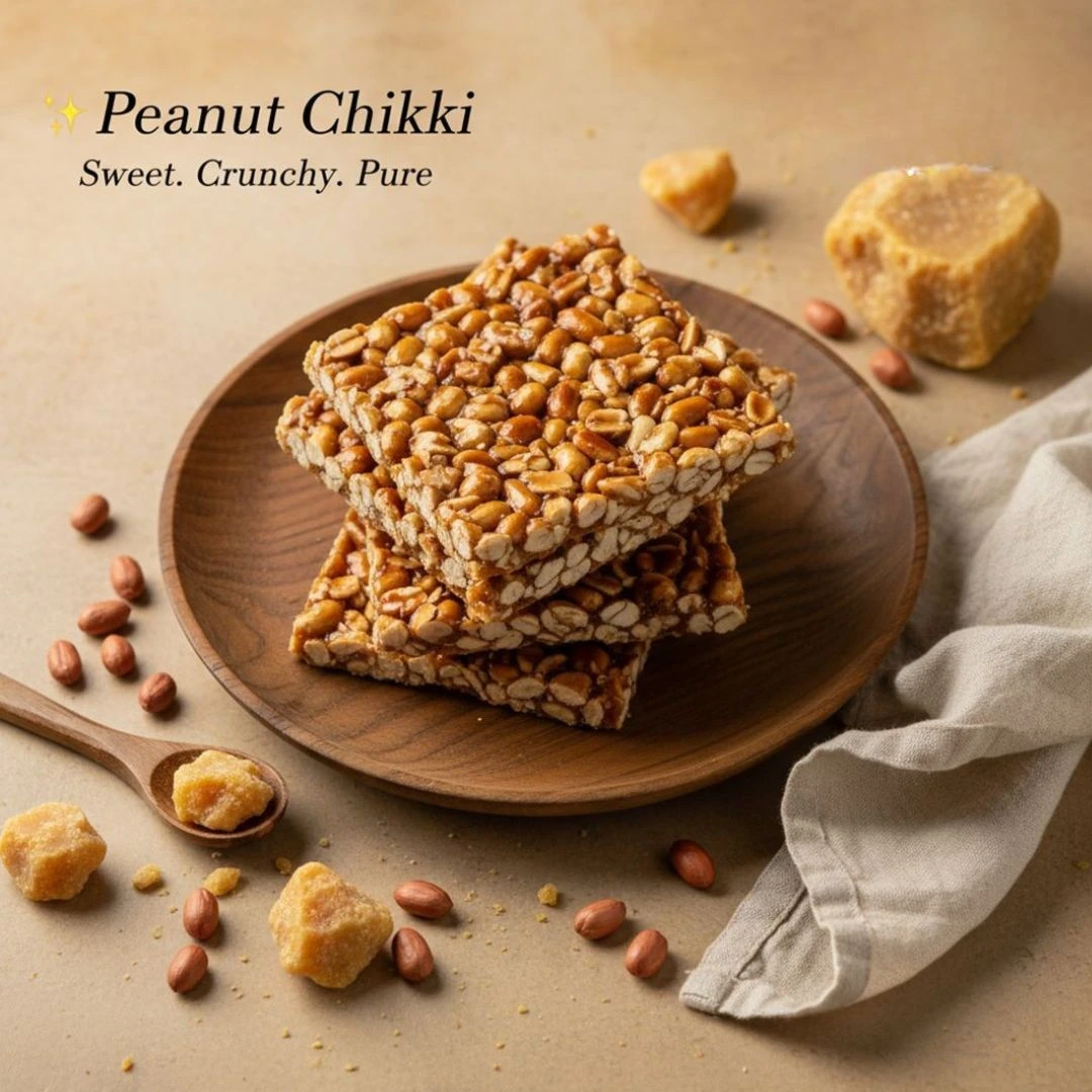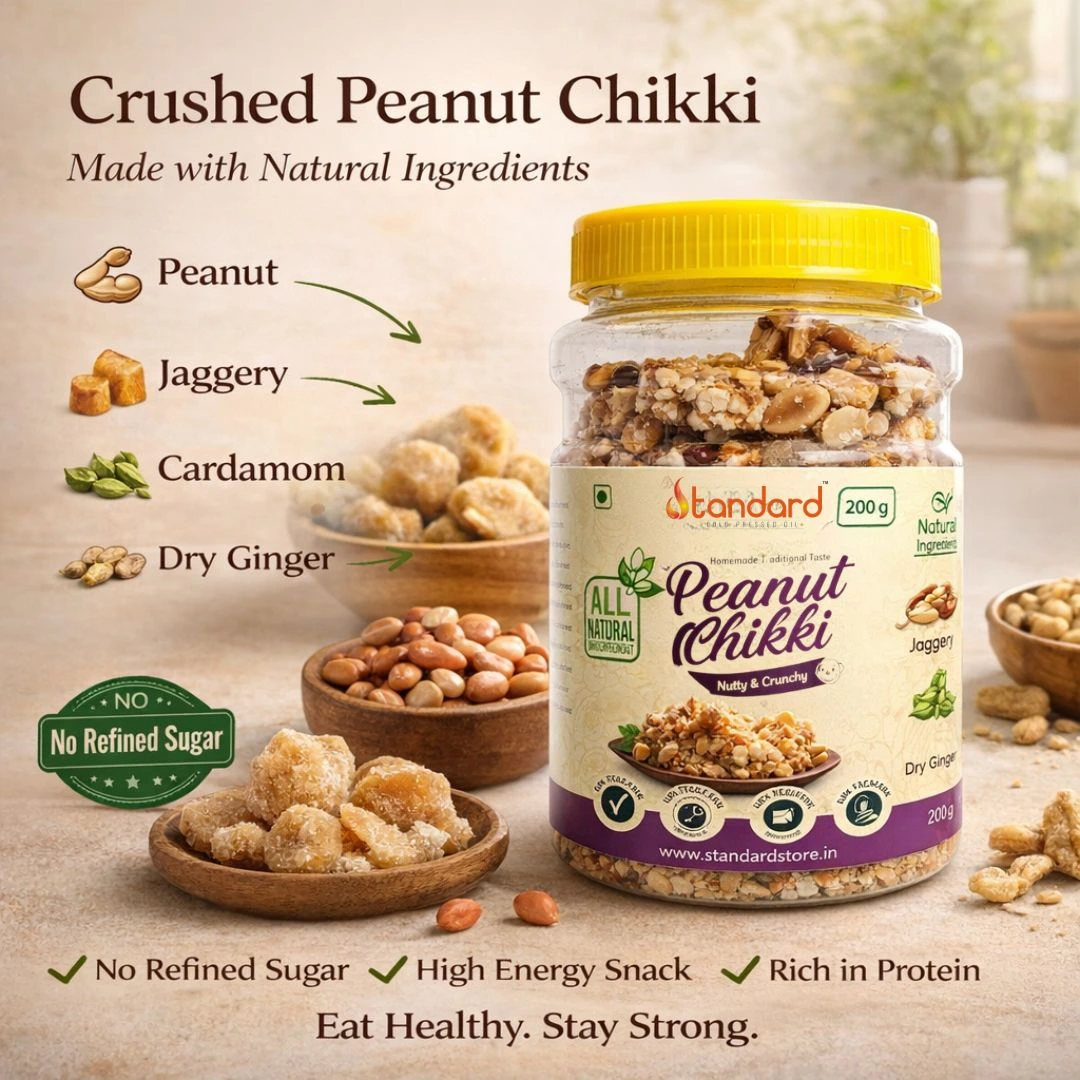 is made with groundnut/peanut and cane jaggery syrup as main ingredient. One of a very healthy & hygienic snack, rich in protein and goodness of cane jaggery has iron supplements.