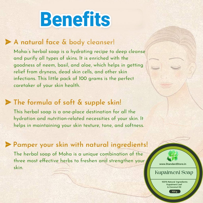 Kuppaimeni, also known as Indian Nettle or Acalypha indica, is a medicinal plant widely used in traditional Ayurvedic and folk medicine. While there isn’t specifically a “kuppaimeni soap,” kuppaimeni extract or oil is often used as an ingredient in herbal soaps due to its potential benefits for the skin. Here are some potential benefits associated with kuppaimeni for skincare:
