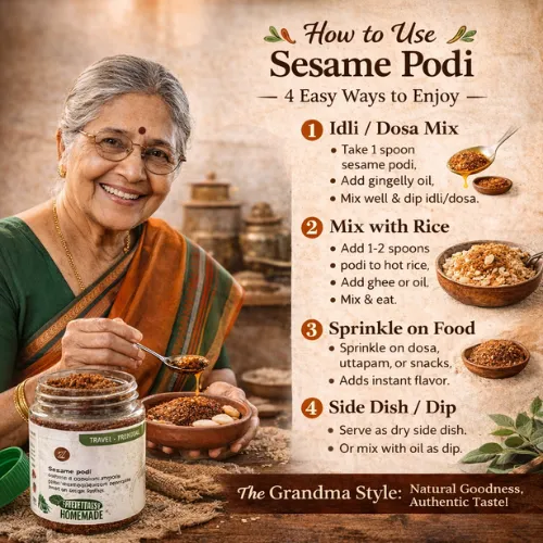 HOW TO USE:Best served with Idly, Dosa & Uthappam by mixing cold pressed gingelly oil or cow ghee to the powder. Store in a Cool, Dry Place.