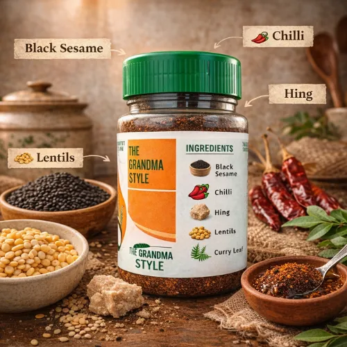 INGREDIENTS:Sesame, Bengal Gram Dal, Urad Dal, Pepper, Cumin, Asafoetida, Red Chilli & Salt
